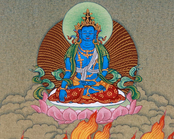 Immerse yourself in the potent symbolism of Bhutadamara Bodhisattva with this exquisite Tibetan thangka, artfully rendered in natural stone hues. Known as the "Conqueror of Spirits," Bhutadamara embodies the compassionate yet fierce energy of Vajrayana Buddhism, offering protection and dispelling obstacles on the spiritual path. This hand-painted artwork showcases intricate Tibetan artistry, depicting Bhutadamara in a dynamic stance with symbolic attributes that symbolize his ability to transform fear into courage. Ideal for meditation spaces and collectors of sacred Buddhist art, this thangka invites contemplation and connection with the Bodhisattva's profound teachings.