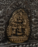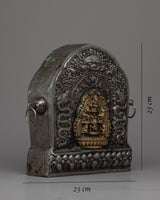 The intricately crafted brass statue that adorns the exterior of this Ghau Box is what makes it unique. This brass statue symbolizes the spiritual heart of Tibetan culture and is more than just a pretty decoration. It is a visual masterpiece that adds a touch of elegance to your living space and stands 23 cm tall.