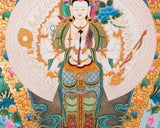 The Lokeshvara Bodhisattva Thangka is a representation of compassion and enlightenment in Tibetan Buddhism. Lokeshvara, also known as Avalokitesvara, is a revered bodhisattva embodying boundless compassion. This Thangka depicts Lokeshvara in a meditative pose, often with multiple arms and symbolic attributes. The vibrant colors and meticulous details of the Thangka serve to convey the spiritual depth and significance of Lokeshvara's compassionate presence. Devotees turn to the Lokeshvara Bodhisattva for blessings of compassion, mercy, and assistance in times of need. The Thangka serves as a visual representation and a focal point for meditation, inspiring practitioners on their spiritual journey toward enlightenment. This larger-than-life portrayal allows for a more immersive and impactful visual experience, with the intricate details and vibrant colors accentuating the spiritual depth of Lokeshvara's presence.