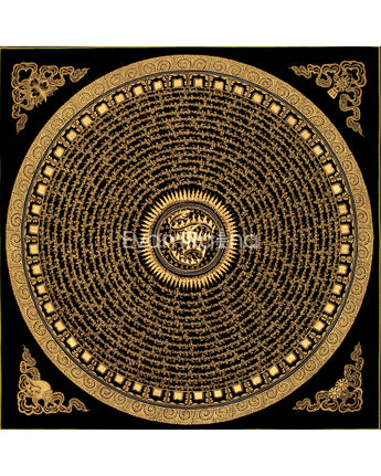 Black Gold Mantra Mandala Thangka | Hand Painted Om Mani Padme Hum Thanka Art