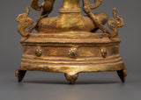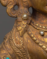 Gold-Plated Bodhisattva Statue with Antique Finish is a stunning handcrafted depiction of the enlightened person who promises to help all sentient beings. This statue is 19.5cm tall, 13cm broad, and weighs 1.13kg. It is constructed of copper with a deep antique finish and is embellished with exquisite artificial stones. It suits Buddhist altars, meditation rooms, and spiritual home decor.