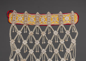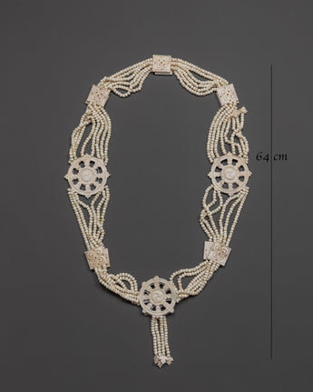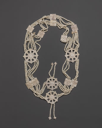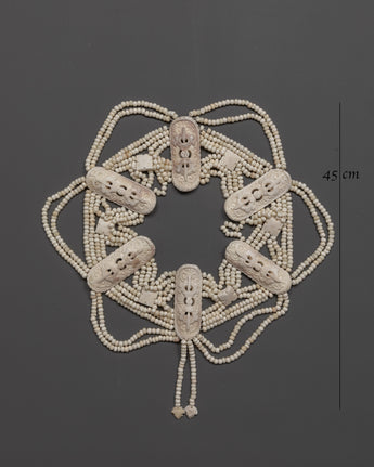 This Bone Ornament Set is a beautifully handmade collection of ritual jewelry created from responsibly sourced buffalo bone that honors the rich cultural history of Himalayan craftsmen. The ensemble comprises a crown, choker necklace, armlet, apron, long necklace, and earrings, all beautifully crafted to complement ceremonial clothing. The crown is 37 cm tall and 21 cm wide (0.836 kg), the choker necklace is 45 cm long (0.516 kg), the armlet is 84 cm by 69 cm (single weight 0.138 kg, total 0.278 kg), the apron is 84 cm by 69 cm (2.13 kg), the long necklace is 64 cm long (0.548 kg), and the earring set is 19 cm by 5.5 cm (total weight 0.102 kg). The total ensemble weighs 4.846 kg and combines aesthetic appeal with ritual utility. The intricate carving and polishing of the buffalo bone highlight traditional craftsmen's artistry and dedication, elevating this set beyond jewelry to a spiritual emblem.