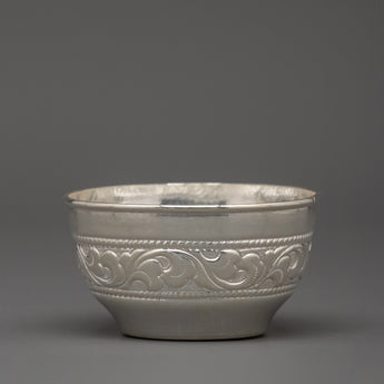 These bowls, embellished with delicate floral carvings around the middle, fulfill a ceremonial function and exude visual beauty. In Buddhist practice, such bowls are filled with water to symbolize charity, cleanliness, and clarity. Their delicate craftsmanship complements any shrine, puja table, or meditation altar.