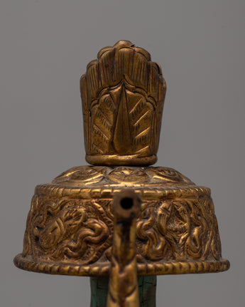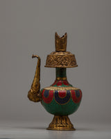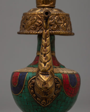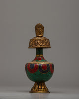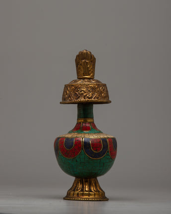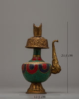 The Bhumba, or Ritual Vase, is an important ceremonial item used for holding holy water that has been blessed by the Guru. These are called the “chief” or “principal” vase, and the “action” or “working” vase. The principal vase is filled with holy water and remains upon the altar in the monastery or temple, while the action vase is used for the actual pouring of water for purification during the various stages of the ritual.
