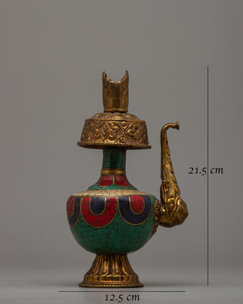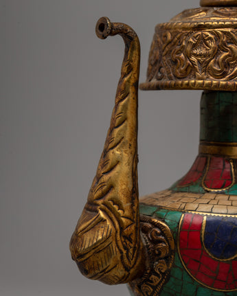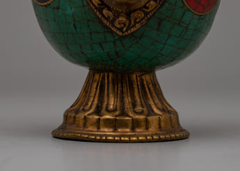 We are pleased to present our magnificent Brass Bhumba Set, which combines timeless elegance with durability through painstaking handcrafting on a blend of copper and brass. This set has two finely created items embellished with artificial stones, such as lapis lazuli, turquoise, and coral, lending an air of refinement and extravagance to their designs.