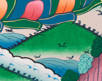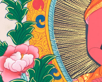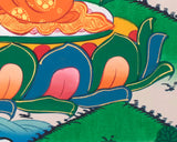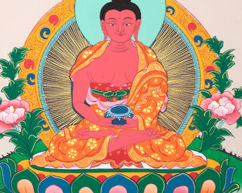 On our thangka, which was traditionally painted by hand, is the Amitabha Buddha. Natural stone colors and 24K gold are used to finish the artwork.