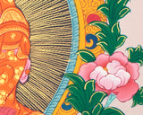 The Amitabha Buddha, also known as Infinite Light, as it is shown magnificently in this Painting. This is hand painted in Kathmandu by a Nepali artist.