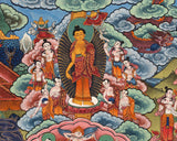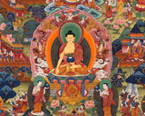 This rare vintage thangka of Buddha Life story was procured in the 1980's, perfectly maintained and kept for all these years is available for you. Shakyamuni Buddha is depicted in this thangka together with the two main disciples as it appears in the most classical representations.