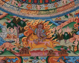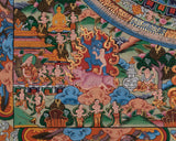 This Buddha Mandala Thangka is an exquisitely detailed portrayal of the Wheel of Dharma, focusing on the Buddha's life and teachings. The core circle depicts a seated Buddha radiating wisdom, flanked by images of other Bodhisattvas and deities representing characteristics such as compassion, wisdom, and power. The mandala is ringed by concentric rings representing the various realms of existence, including the six realms of samsara, which include the heavens, human realm, animal world, and hell creatures. The clouds that surround the mandala represent the transient nature of existence and the knowledge that transcends these cycles. There are numerous symbolic figures dispersed throughout, each symbolizing a crucial Buddhist concept on the path to enlightenment, ranging from the gates of desire to the regions of freedom. This thangka is hand-painted on cotton canvas with 24K gold and acrylic paint by a skilled Nepali artist, ensuring vibrant colors and lasting quality.