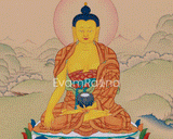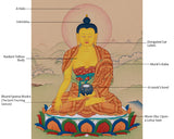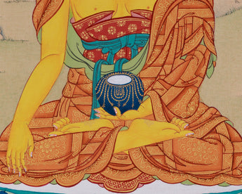 Shakyamuni Buddha, known as Siddhartha Gautama, is esteemed as the enlightened teacher who elucidated the pathway to liberation. This thangka depicts him in the Bhumisparsha Mudra (Earth Touching Gesture), representing the moment of his enlightenment under the Bodhi tree. The radiant yellow body reflects purity and spiritual illumination, while the serene expression signifies inner peace. The monk’s robe, adorned with intricate patterns, represents simplicity and renunciation. The lotus seat and moon disc signify purity and the enlightened mind, while the monk’s bowl symbolizes detachment from worldly desires. The halo around his head illuminates his spiritual presence, highlighting his role as the guiding light of Buddhism.