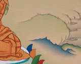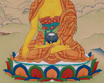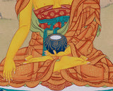 This exquisite thangka gracefully depicts the Buddha Shakyamuni, the founder of Buddhism. Hand-painted with natural stone colors and genuine gold, it harmonizes natural elements and spiritual symbols in the Karma Gadri style. The fine cotton canvas provides a soft texture, while gold detailing highlights the Buddha's serene aura.