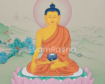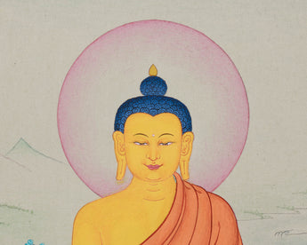 This hand-painted Buddha Shakyamuni Mini Thangka is a unique and culturally authentic piece, painted on premium cotton canvas using natural stone pigments and acrylics. The Buddha is depicted in serene meditation with the earth-touching mudra, symbolizing his moment of enlightenment under the Bodhi tree. The artwork's surrounding decorative motifs emphasize peace and enlightenment, ensuring lasting vibrancy and authenticity.
