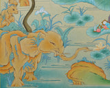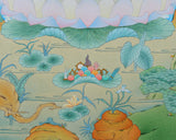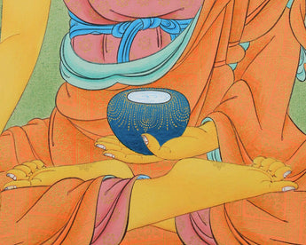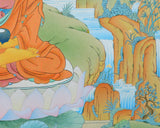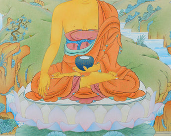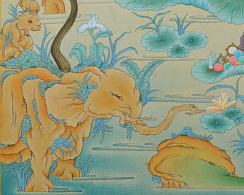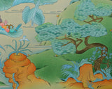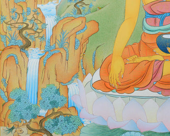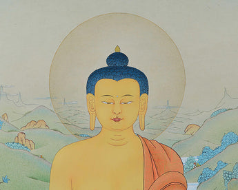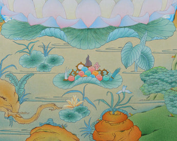 In the thangka, Buddha is placed at the center, surrounded by snow mountains, rocks, trees, rivers, and streams. Even though there are many subjects in the background, somehow the whole painting looks soft and calm. Just like the quality of Buddha- Calm and still. We have used soft green and blue to bring harmony with the golden body of Buddha. Hence whole painting looks balanced and harmonious.