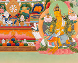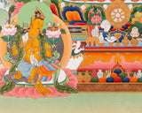 Maitreya Buddha, the future Buddha, is portrayed as a bodhisattva awaiting his time to manifest enlightenment. His presence in the thangka symbolizes hope and the continuity of the Buddha's teachings across time.
