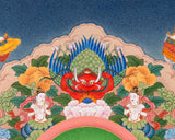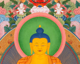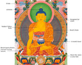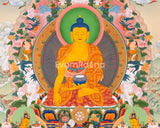 Buddha Shakyamuni, the central figure, is seated on a lion throne, symbolizing his fearless and regal presence.His aura, or nimbus, is depicted as a radiant halo filled with precious jewels and stones, symbolizing the enlightenment and purity of his being.