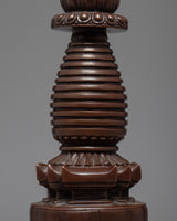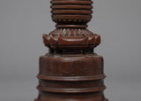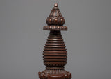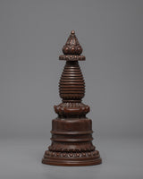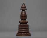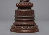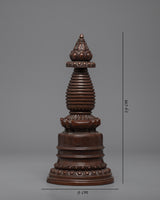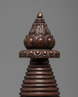 The stupa is a wonderfully crafted copper-bodied handmade Buddhist shrine. The stupa has lovely patterns. The top contains thirteen umbrella wheels that are finely made, as well as additional carvings in a similar style.