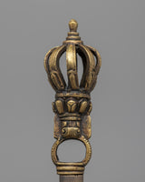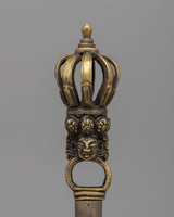 The vajra's five-pronged design symbolizes the transformation of the five basic delusions—ignorance, attachment, aversion, pride, and jealousy—into the wisdoms connected with the five Buddhist families. When combined with the bell, which represents the feminine component of wisdom and emptiness, the set represents the ideal balance of active compassion and insightful wisdom. The vajra and bell are used combined in rituals to signify the path to enlightenment, gathering a profound understanding of Buddhist teachings through harmony, non-dual consciousness, and the attributes of a fully awakened mind.