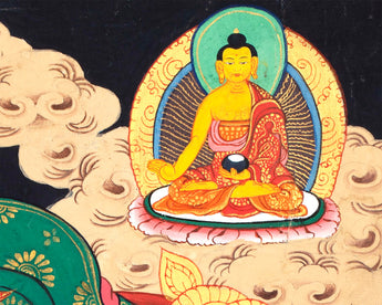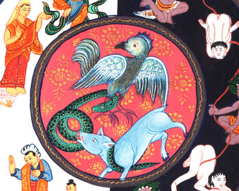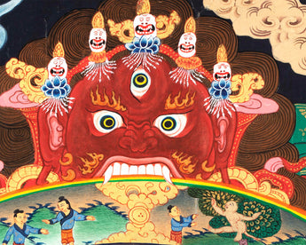 Our thangka is a beautifully painted thangka portraying the Buddhist Bhavachakra. We painted it with 24 karat gold and colors derived from nature. The thangka depicts Yama, the God of Death, clutching the wheel that marks the gateway to the afterlife from these worlds of misery (nirvana).