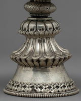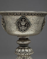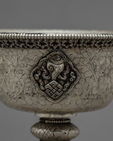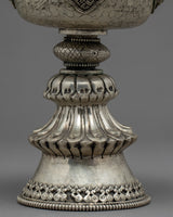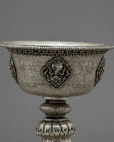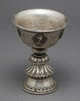 Our butter lamp is entirely made by hand hammering and silver-plating is done by electroplating. It is engraved and hand-carved with various auspicious symbols providing its own symbolization. Many designs are made in the lamp to give it a more vintage look.
