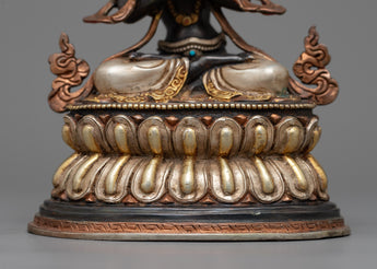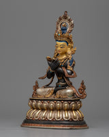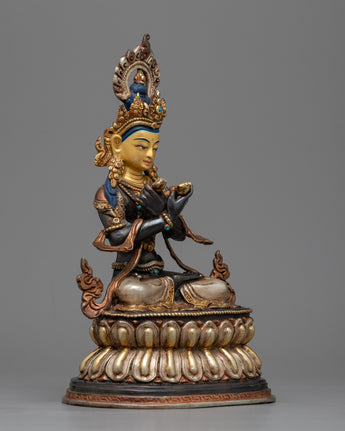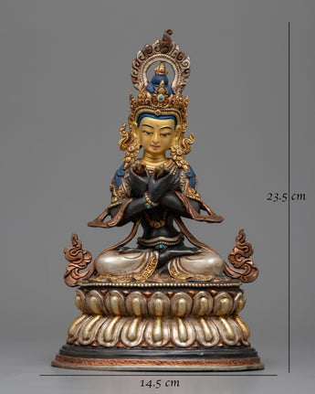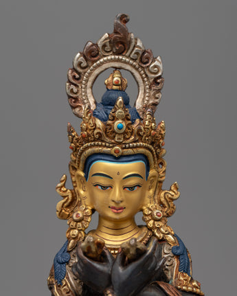 Begin your spiritual journey with our Buddhist Deity Vajradhara Statue. Handcrafted with great care on a copper body and embellished with lavish gold plating, this masterpiece stands at a magnificent height of 23.5cm, exuding a divine presence that captivates the spirit. As you examine the statue's delicate features, feel the profound energy of Vajradhara embrace you, guiding you to enlightenment and inner serenity.