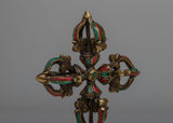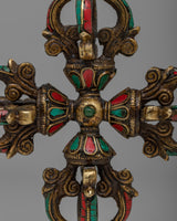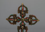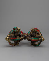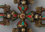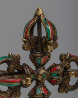 Presenting the Buddhist Double Vajra, a priceless handcrafted brass symbol of enlightenment and spiritual strength. This magnificent piece, embellished with synthetic stones like coral and turquoise, represents strength and devotion.