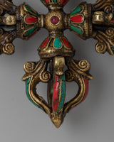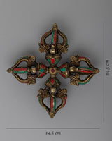 The double vajra's brass body, handcrafted with care and precision, has a classic elegance. The carefully inlaid turquoise and coral stones give the symbol a deeper meaning and significance while also adding a vibrant touch.