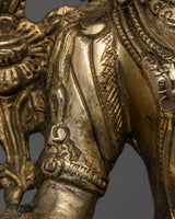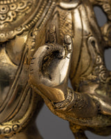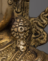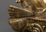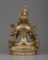 The Buddhist Goddess Tara Statue is skillfully handcrafted on a brass body, displaying the artisans' devotion and craftsmanship. Tara is a Buddhist deity who is revered as the embodiment of compassion and wisdom. Tara is depicted in a graceful and compassionate pose, sitting on a lotus base in the statue. The use of brass as a material adds elegance and durability to the statue, while the intricate details capture the goddess's serene expression and divine presence. This handcrafted masterpiece is a symbol of inspiration and guidance, reminding people of Tara's qualities of compassion, protection, and liberation in Buddhist philosophy.