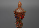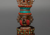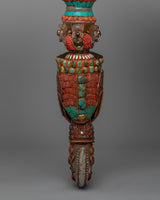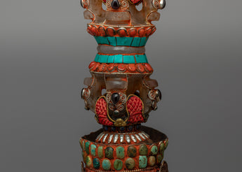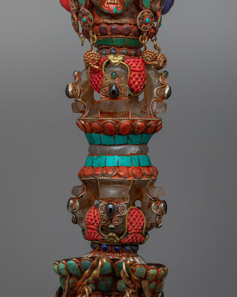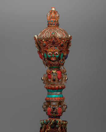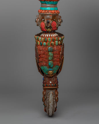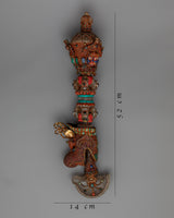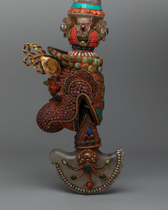 The Buddhist Kartika Knife is a traditional tantric ceremonial knife. This knife has a silver body with intricate detailing and precious gemstones such as Ruby, Emerald, Coral, Turquoise, and Black stone. The knife's three faces are dyed conch shells, with blue, green, and red faces. The Kartika knife is used in Buddhist ceremonies to cut through attachment and negative emotions, and this beautifully crafted piece represents spiritual transformation and enlightenment.