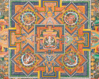 There are several types of mandalas based on the attributes of the central god. The Dhyani Buddha Mandala is the most traditional pattern. This thangka depicts the Buddha Mandala. The Mandala represents the "palace of purity," a magical sphere cleansed of all spiritual impurities. This map illustrates the Map of a Mind (teaching of Buddha).