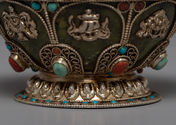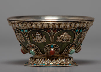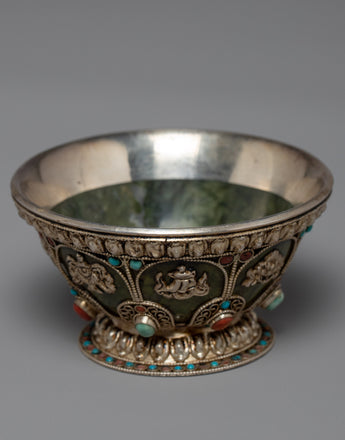 Our Buddhist Offering Bowl is handcrafted with auspicious Buddhist symbols. It's a silver-plated jade bowl with original gemstones and wonderful decoration that'll look great on your ritual altar.