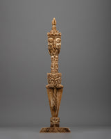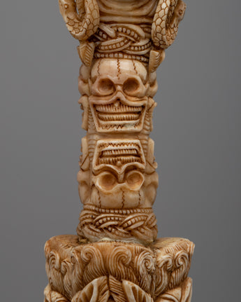 This Phurba's elaborate imagery has profound spiritual significance. Three furious Buddhist deities, each facing a different direction, are carved at the top to represent the all-seeing ability to defeat evil and defend the dharma. The expertly crafted skull heads in the center, oriented upward and downward, symbolize the passing away of existence and the victory over death. The base's three sharp blades pointing in various directions represent the three fundamental sources of suffering, ignorance, attachment, and aversion. This strong Phurba stands atop a lotus holder embellished with a skull head, representing purity and spiritual enlightenment amongst the impermanence of existence. This Phurba is an important ritual item that promotes protection, transformation, and the eventual attainment of wisdom.