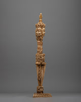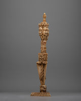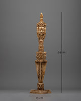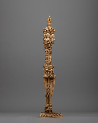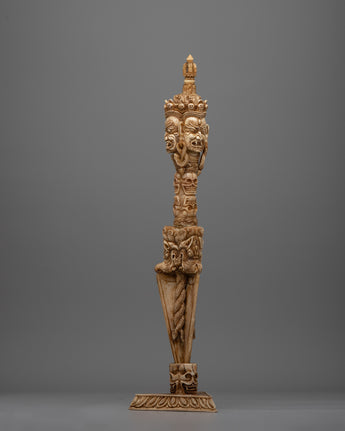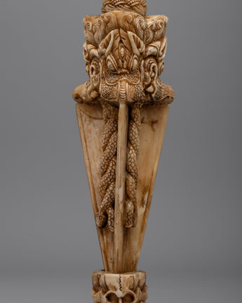 This handcrafted Buddhist ritual bone phurba is a revered ceremonial item that reflects traditional artistry and spiritual regard. It is made from buffalo bone that is ethically obtained. At an astounding 54 cm in height, 15 cm in width, and 1.15 kg in weight, this Phurba is not only a work of outstanding artistry but also has significant religious significance in Tibetan Buddhism. The Phurba, also known as the ritual dagger, is regarded as a potent weapon for destroying ignorance, suppressing evil forces, and removing barriers. Because it was made from buffalo bone, it emphasizes the spiritual practice of respecting all life, making it a sacred and ethically meaningful artifact.