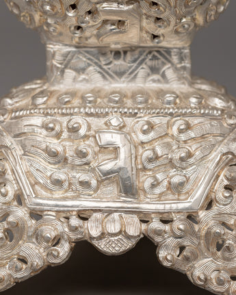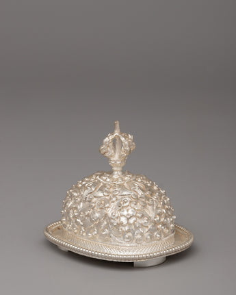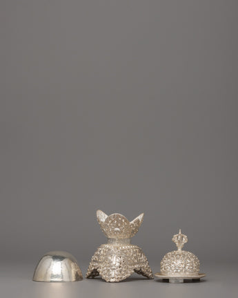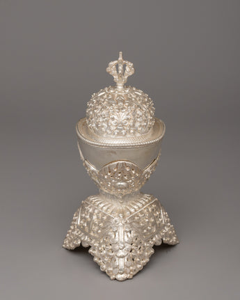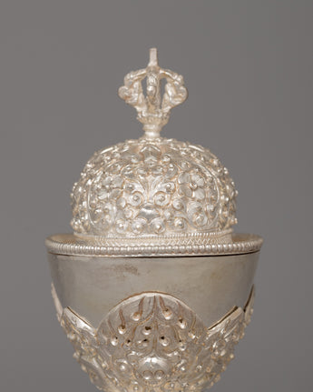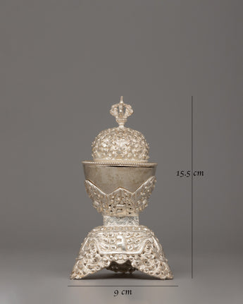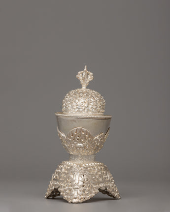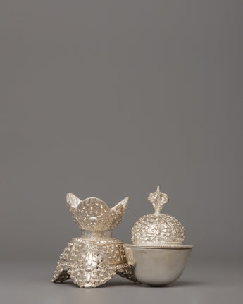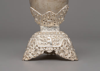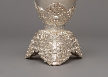This Buddhist Ritual Item Kapala Set is skillfully created from pure silver and stands 15.5 cm tall and 9 cm wide. This ritual cup, weighing 0.794 kg, represents the greatest craftsmanship and spiritual purpose. The Kapala, traditionally associated with tantric rites, is a sacred item in Buddhist practice that represents energy transmutation and connection to deities. The silver material denotes purity, reflecting the profound spiritual meaning that drives its use in rituals. This Kapala set is used extensively in purifying, offering, and spiritual ascension ceremonies.
