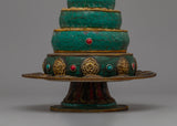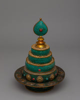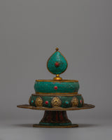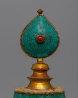 This mandala, which measures 29.5 cm in height by 13.5 cm in breadth and weighs 0.94 kg, is both an aesthetically striking and deeply spiritual artifact. Its artistic elegance is highlighted by the combination of copper, turquoise, and coral; also, its spiritual symbolism provides a deeper connection to Buddhist teachings. The essence of blessings is invited when you incorporate this mandala into your environment, which makes it an ideal complement to any altar or meditation place.