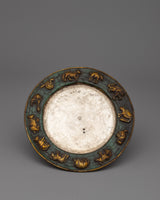 This Buddhist Ritual Mandala, beautifully created from copper with Electro Gold Plated and inlaid turquoise, is a stunning representation of spiritual harmony and balance. The mandala, inlaid with colorful coral, serves as an effective tool for ceremonial activities, meditation, and offerings. Its stunning layout includes the Eight Auspicious Symbols, which signify blessings like wisdom, prosperity, and enlightenment. These sacred symbols encircle the base of the mandala, adding to its spiritual value and providing a very meaningful focal point for practice.
