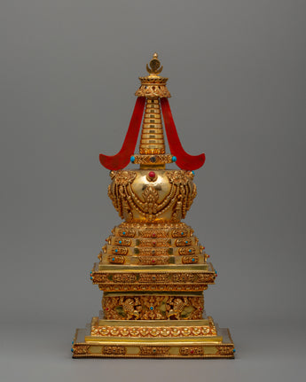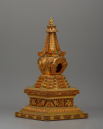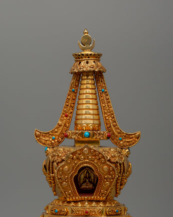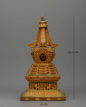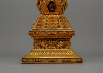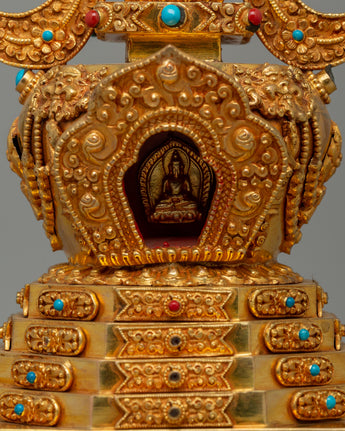 Our Stupa of Reconciliation is a beautifully created spiritual relic made of copper and richly gold-plated, with artificial stone turquoise and coral inlays. This magnificent artwork, measuring 33.5 cm in height by 18 cm in breadth and weighing 1.50 kg, is excellent for holy places, altars, and Buddhist temples. The stupa, a revered symbol in Tibetan Buddhism, represents the Buddha's enlightened mind and functions as a conduit for spiritual energy. The gold plating emphasizes its religious meaning, while the inlaid turquoise and coral gemstones provide harmony, healing, and protection to people who pray and meditate.