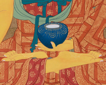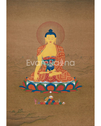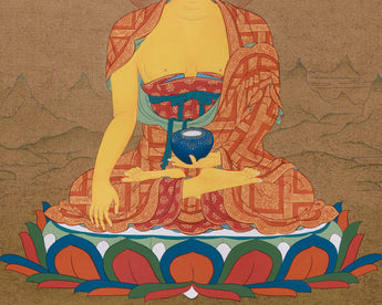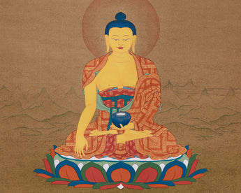 The Buddhist Thangka of Shakyamuni Buddha is an original piece from our Enlightenment Studio. Painted on high-quality cotton canvas, it incorporates 24K gold and acrylic colors. Each component is hand-painted using traditional brush techniques, ensuring fine line detailing and smooth gradation. To enhance its radiance and sacred significance, 24K gold is applied in elegant accents, especially in the bowl and robe embellishments, preserving the painting's brilliance and affirming its continuing role as a devotional object.