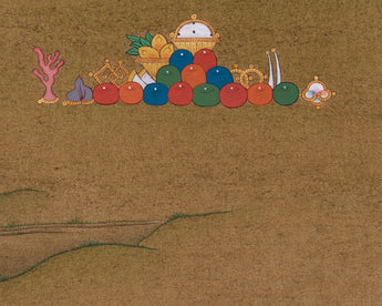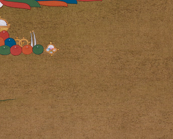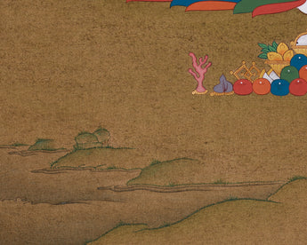 The painting is completed in the traditional Karma Gadri style, a Tibetan artistic tradition known for its balanced composition, open landscapes, and spiritual elegance. This style prioritizes clarity of form and subtle color harmony, often incorporating natural backgrounds to create an atmospheric depth without overwhelming the central deity. The result is a visually spacious and meditative presentation, highlighting the essence of the Buddha with grace and presence.