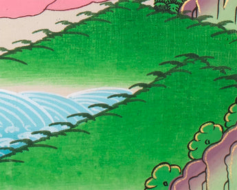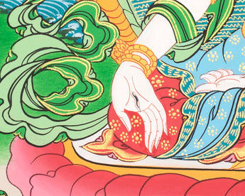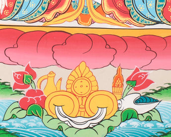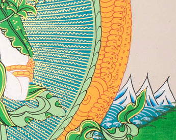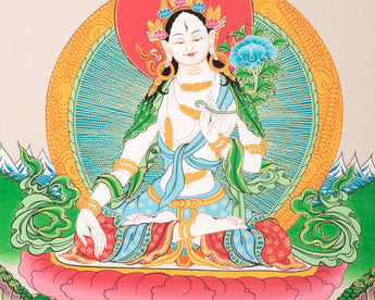 The stunning environment in the background of our lovely Thangka artwork adds to the beauty of the Buddhist White Tara. The offering material and auspicious symbols are located in the center of the bottom register.