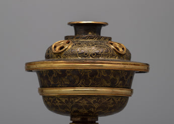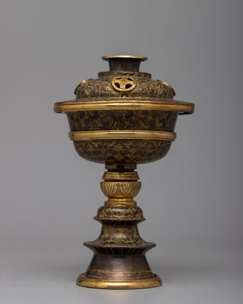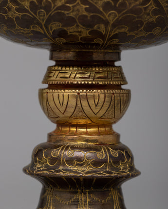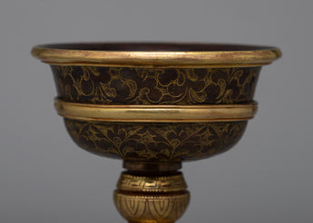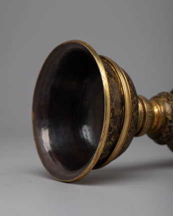 The Butter Lamp Offerings Set is expertly carved on oxidized copper bodies and gold plated to illuminate your sacred offerings. With a height of 18 cm, and an inner depth of 5 cm, each lamp is tastefully designed to hold your sincere offerings. The set as a whole weights 1.40 kg and combines excellent workmanship with functionality.