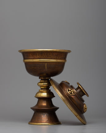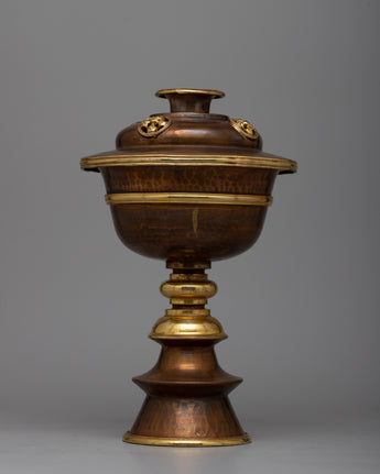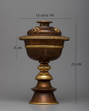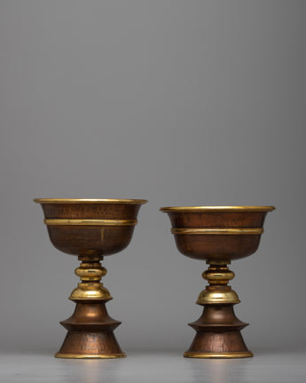 With this exquisite handiwork on oxidized copper bodies, the Butter Lamps Nepal will enchant your sacred area with their mesmerizing glow. With a height of 25 cm, each lamp is elegantly constructed and has an 8 cm inner depth to accommodate your offerings. The set as a whole weights 2.46 kg and combines amazing workmanship with functionality.