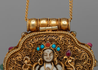 An intricate depth of spiritual richness is added by the meticulous carving of White Tara, who is revered for her healing, compassion, long life, and tranquility, inside the locket. A mystical prayer that offers the wearer protection and spiritual strength is meticulously engraved on the reverse. This Chenresig Ghau Box Locket is more than simply a piece of jewelry; it's a personal haven, a marriage of beautiful craftsmanship with heavenly protection, perfect for anybody who wants to keep their blessings and prayers near at hand.