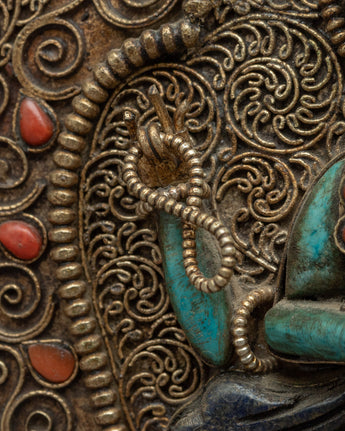 The gemstones are carefully inlaid into the copper body to improve its appearance and feel. The Ghau pendant is a significant and revered symbol in Tibetan Buddhism, and it is thought to provide protection and blessings to those who wear it.
