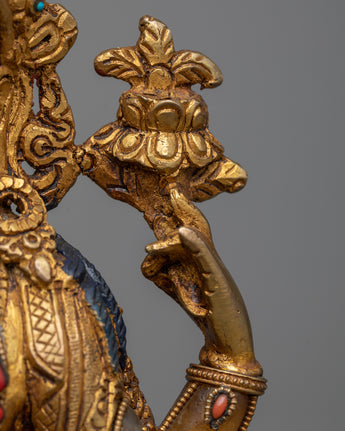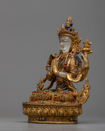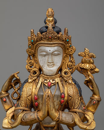 Introducing the Chenresig Meditation Statue, a sublime representation of compassion and enlightenment. This statue, carved from pure crystal stone, exudes a serene energy that encourages practitioners to deepen their meditation and inner reflection. The sections plated with radiant 24k gold are expertly crafted from copper, ensuring both durability and elegance.