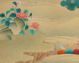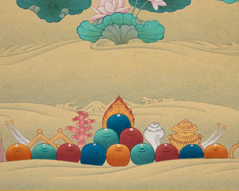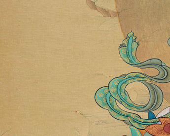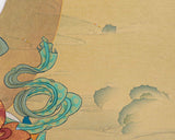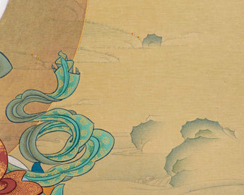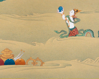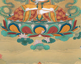 The "Chenrezig Avalokiteshvara Thangka in Traditional Karma Gadri Style" is a profound representation that immerses us in the essence of compassion and spiritual grace. Meticulously hand-painted on pure cotton canvas, this Thangka captures the divine presence of Chenrezig Avalokiteshvara in intricate detail. Crafted in the revered Karma Gadri tradition, it upholds the authenticity of this timeless art form. The use of natural stone colors imparts a soothing, earthy palette to the artwork, deepening its spiritual significance. Enhanced with genuine 24K gold accents, it emits a celestial radiance that symbolizes the Bodhisattva's transcendental blessings. Chenrezig Avalokiteshvara's serene countenance radiates boundless compassion, beckoning those who contemplate it to connect with their inner reservoir of empathy and kindness. This Thangka acts as a gateway to the profound teachings of compassion and wisdom embodied by Chenrezig Avalokiteshvara, inspiring us to tread the path of love, empathy, and enlightenment.