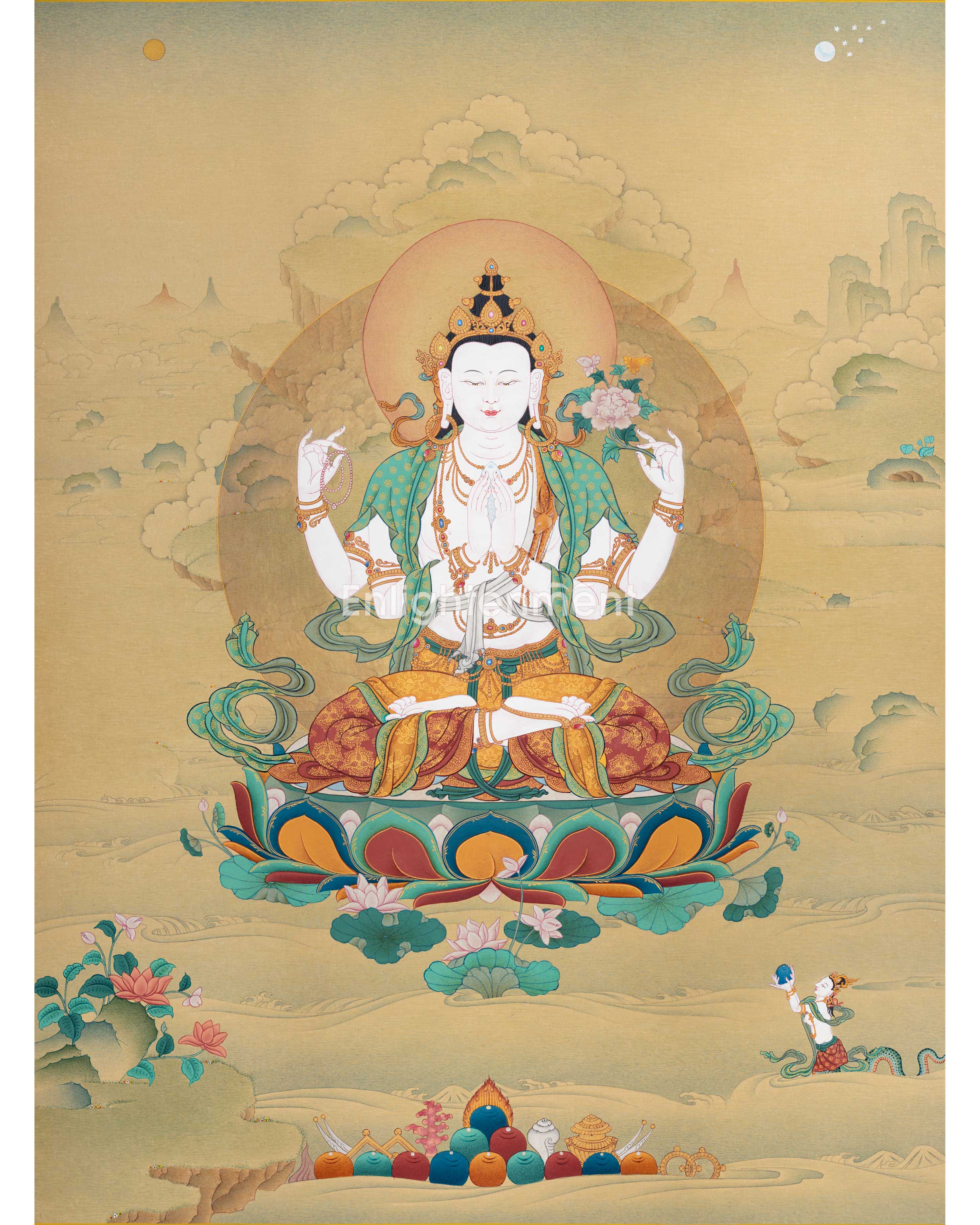 Note: Chenrezig Thangka is an original painting from Enlightenment Studio located at Boudha Stupa.
