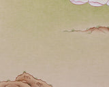 Chenrezig, also known as Avalokiteshvara in Sanskrit, is the Bodhisattva of Compassion, revered across Tibetan Buddhism as the embodiment of the compassionate nature of all Buddhas. With four arms, he represents the four immeasurable qualities: compassion, loving-kindness, empathetic joy, and equanimity. In this thangka, his central hands hold a wish-fulfilling jewel at his heart. In contrast, the others have a lotus flower and a crystal mala, symbolizing purity and continuous compassionate action. Seated on a lotus throne, radiating serenity, Chenrezig serves as a meditative focus for cultivating compassion and spiritual awakening.