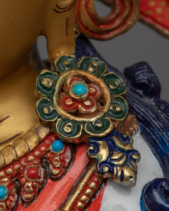 With our painstakingly sculpted Chenrezig statue, you may instill an aura of compassion and peace in your area. This statue, which stands 12.7" tall, 7.8" wide, and weighs 5.27 kg, is a monument to the intricate creation of our experienced Nepalese craftsmen. The statue's sturdy copper body is richly embellished with bright 24k gold, while fine acrylic paints highlight the beautiful craftsmanship, bringing it to life.