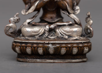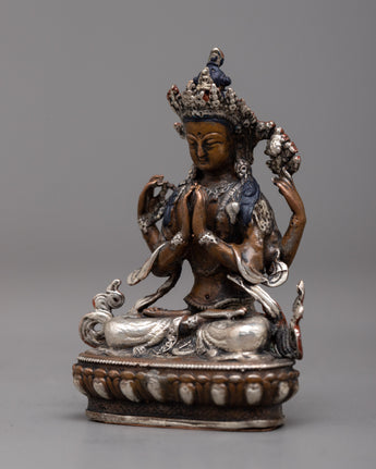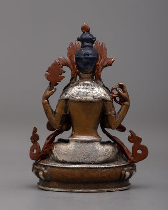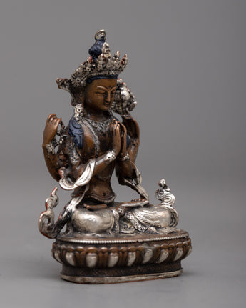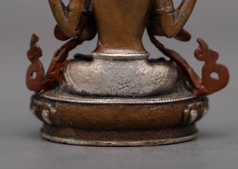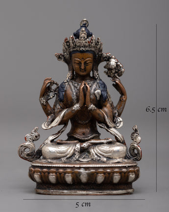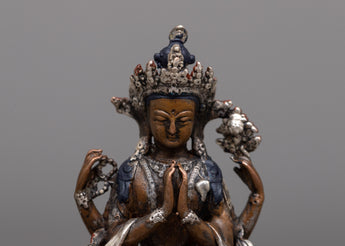 The compassionate nature of Chenrezig, also referred to as Avalokiteshvara, the Bodhisattva of Compassion in Tibetan Buddhism, is embodied in the Chenrezig Oxidized Copper Statue. This statue, which was created using a machine on an oxidized copper body and decorated with silver plating, exudes compassion and calm.