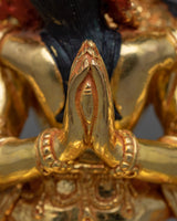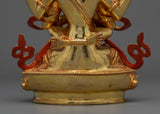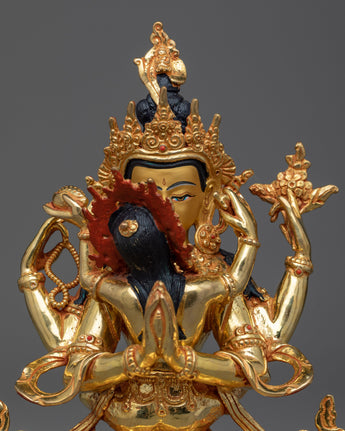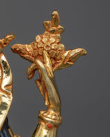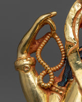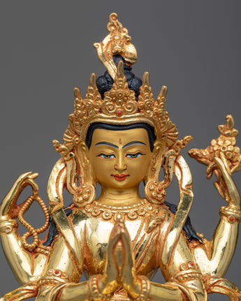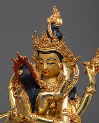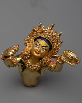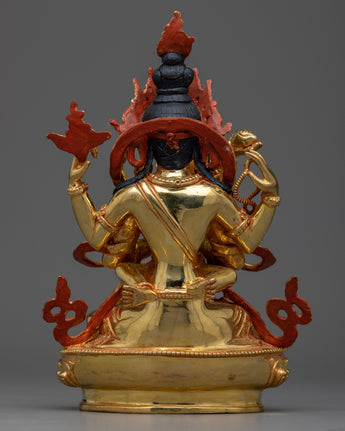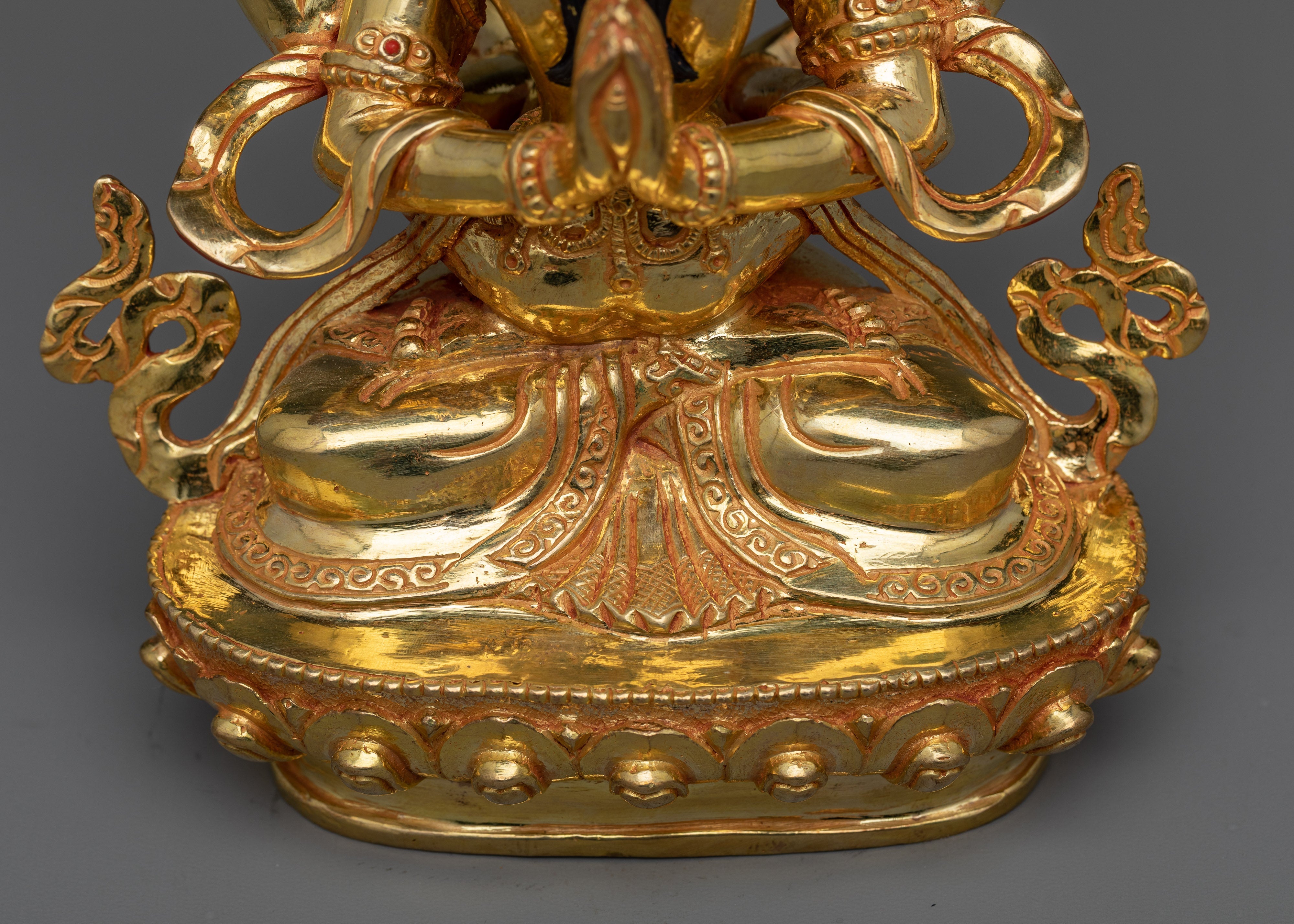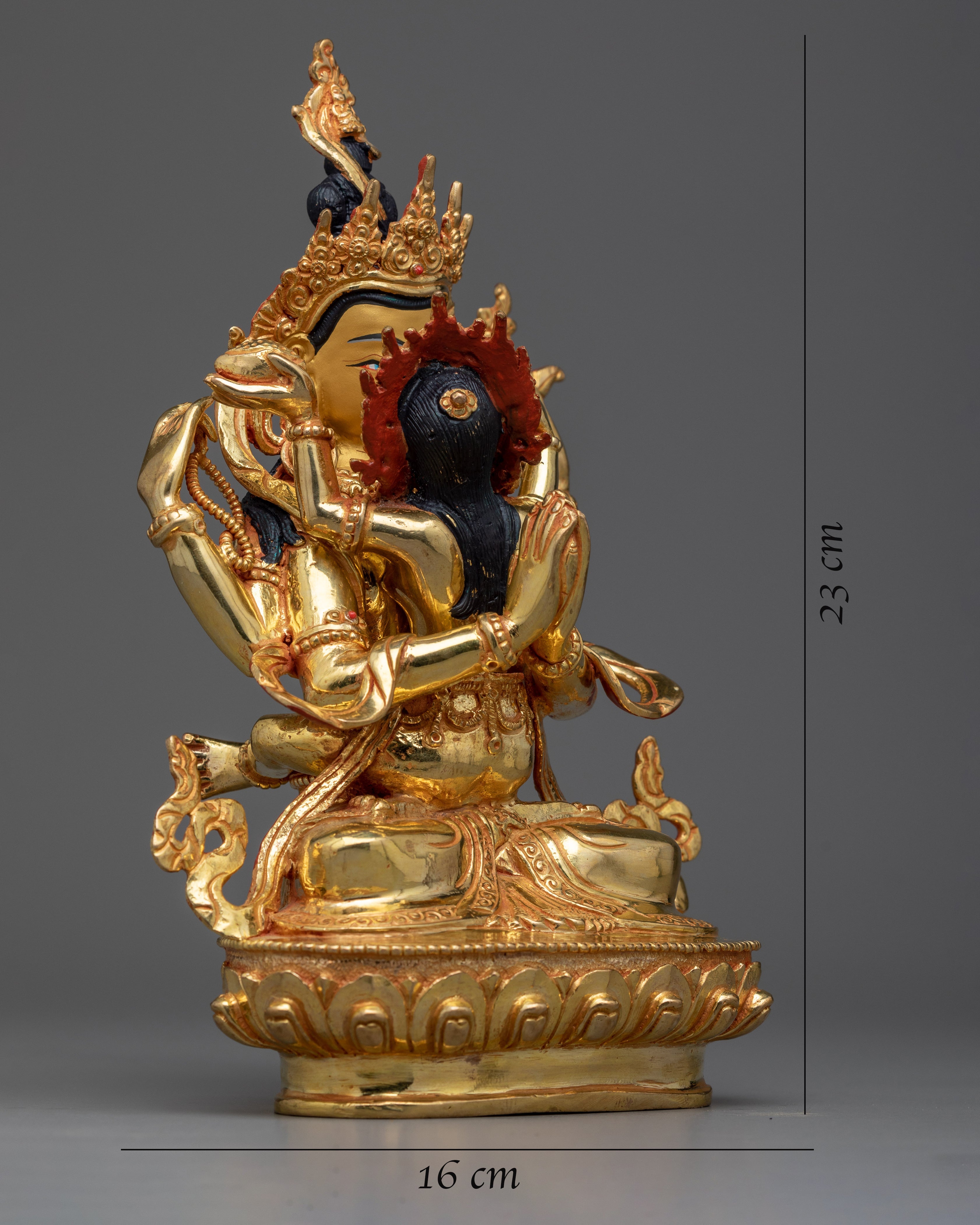 With our Chenrezig with Consort statue, you can immerse yourself in the profound spirit of togetherness. This painting is a true masterpiece, representing the lovely convergence of compassion and wisdom. Carefully crafted, the pendant glows with beautiful Nepalese creativity. Its solid copper body, adorned with gleaming 24k gold gilding and vibrant acrylic paintings, creates a touching and transformative visual narrative.